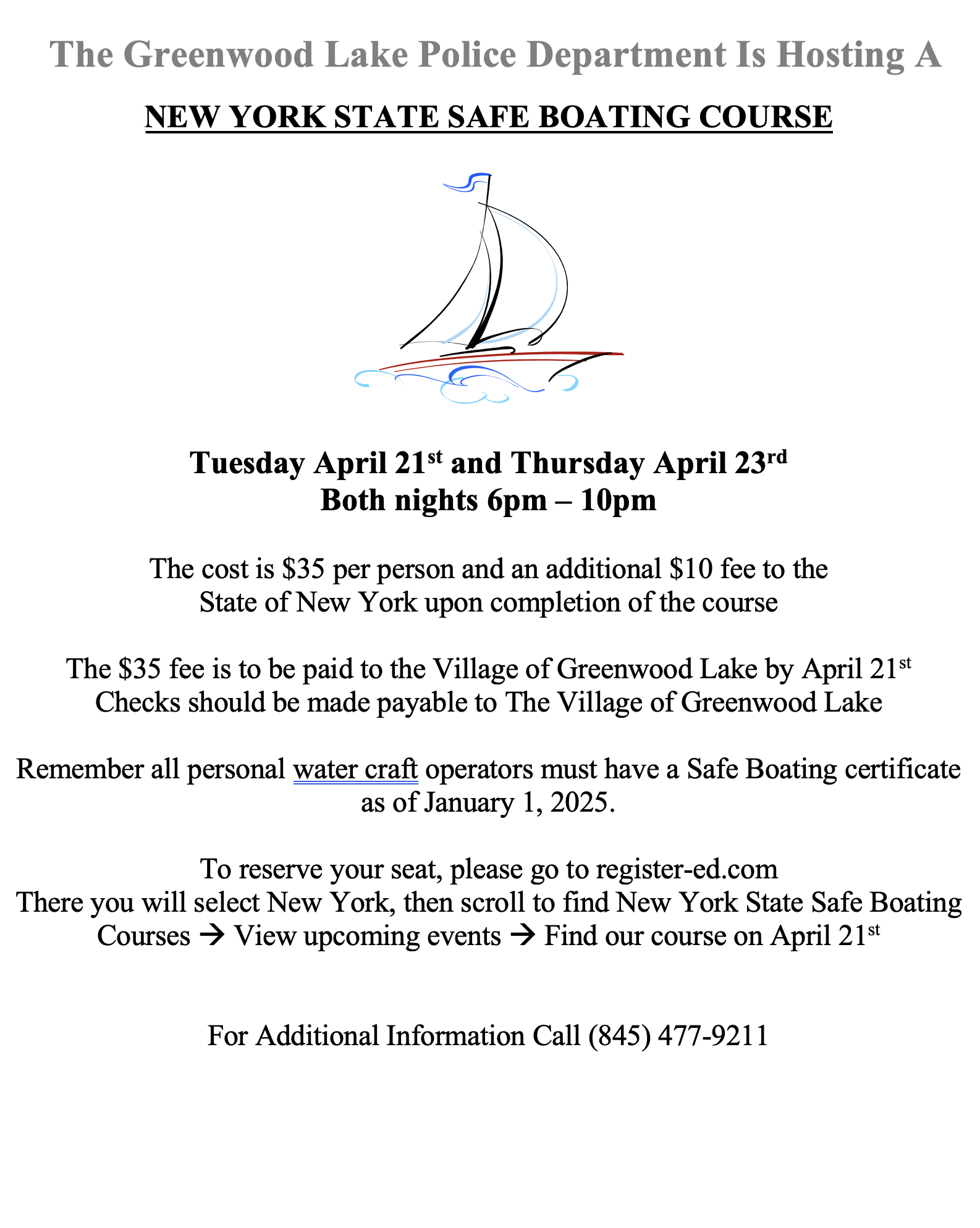 The $35 fee is to be paid to the Village of Greenwood Lake by April 21st